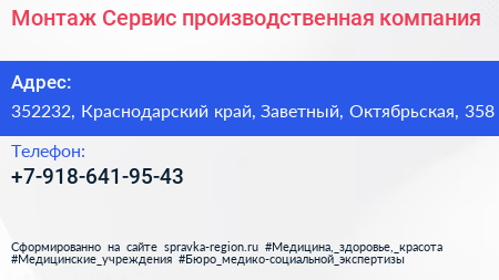 Монтаж-Сервис, производственная компания по адресу 352232, Краснодарский край, Заветный, Октябрьская, 358 в дальнейшем Организация, размещена в следующих категориях: