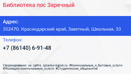 Библиотека, пос. Заречный по адресу 352470, Краснодарский край, Заветный, Школьная, 33 в дальнейшем Организация, размещена в следующих категориях: