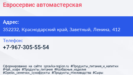 Евросервис, автомастерская по адресу 352232, Краснодарский край, Заветный, Ленина, 412 в дальнейшем Организация, размещена в следующих категориях: