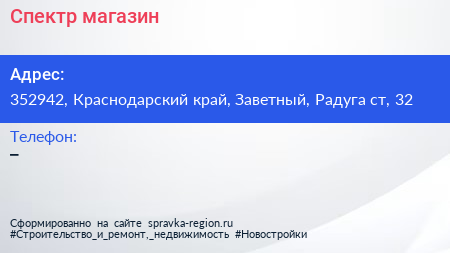 Спектр, магазин по адресу 352942, Краснодарский край, Заветный, Радуга ст, 32 в дальнейшем Организация, размещена в следующих категориях: