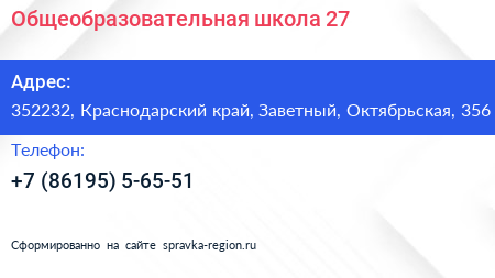 Общеобразовательная школа №27 по адресу 352232, Краснодарский край, Заветный, Октябрьская, 356 в дальнейшем Организация, размещена в следующих категориях: