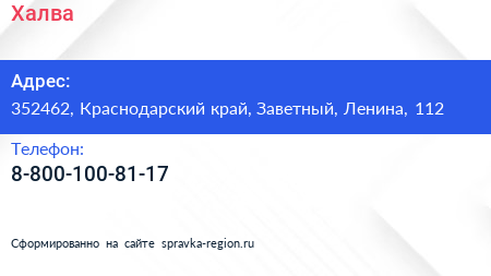 Халва по адресу 352462, Краснодарский край, Заветный, Ленина, 112 в дальнейшем Организация, размещена в следующих категориях: