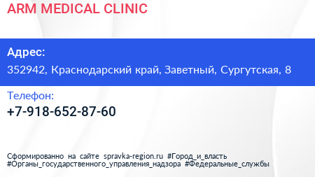 ARM MEDICAL CLINIC по адресу 352942, Краснодарский край, Заветный, Сургутская, 8 в дальнейшем Организация, размещена в следующих категориях: