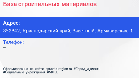 База строительных материалов по адресу 352942, Краснодарский край, Заветный, Армавирская, 1 в дальнейшем Организация, размещена в следующих категориях: