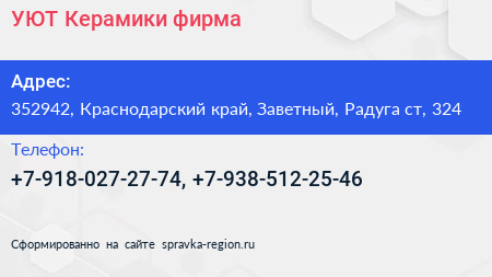 УЮТ Керамики, фирма по адресу 352942, Краснодарский край, Заветный, Радуга ст, 324 в дальнейшем Организация, размещена в следующих категориях: