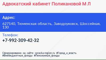 Адвокатский кабинет Поликановой М.Л. по адресу 627140, Тюменская область, Заводоуковск, Шоссейная, 130 в дальнейшем Организация, размещена в следующих категориях: