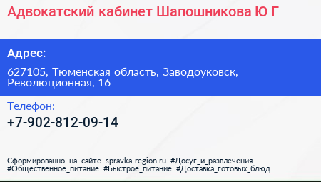 Адвокатский кабинет Шапошникова Ю.Г. по адресу 627105, Тюменская область, Заводоуковск, Революционная, 16 в дальнейшем Организация, размещена в следующих категориях: