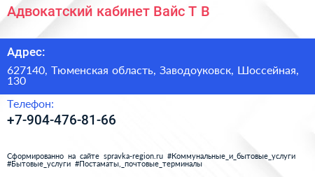 Адвокатский кабинет Вайс Т.В. по адресу 627140, Тюменская область, Заводоуковск, Шоссейная, 130 в дальнейшем Организация, размещена в следующих категориях: