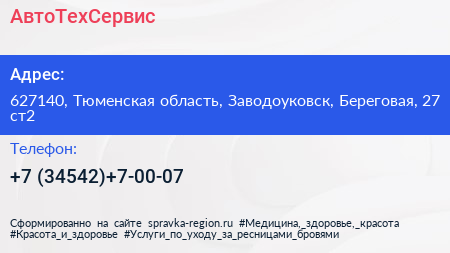 АвтоТехСервис по адресу 627140, Тюменская область, Заводоуковск, Береговая, 27 ст2 в дальнейшем Организация, размещена в следующих категориях:
