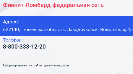 Фианит-Ломбард, федеральная сеть по адресу 627140, Тюменская область, Заводоуковск, Вокзальная, 45 в дальнейшем Организация, размещена в следующих категориях: