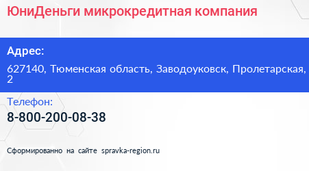 ЮниДеньги, микрокредитная компания по адресу 627140, Тюменская область, Заводоуковск, Пролетарская, 2 в дальнейшем Организация, размещена в следующих категориях: