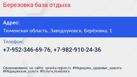 Березовка, база отдыха по адресу Тюменская область, Заводоуковск, Берёзовка, 1 в дальнейшем Организация, размещена в следующих категориях: