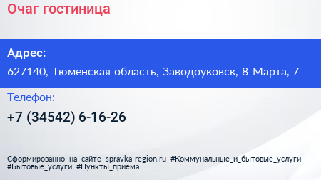 Очаг, гостиница по адресу 627140, Тюменская область, Заводоуковск, 8 Марта, 7 в дальнейшем Организация, размещена в следующих категориях: