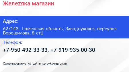 Желеzяка, магазин по адресу 627143, Тюменская область, Заводоуковск, переулок Ворошилова, 8 ст1 в дальнейшем Организация, размещена в следующих категориях: