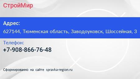 СтройМир по адресу 627144, Тюменская область, Заводоуковск, Шоссейная, 3 в дальнейшем Организация, размещена в следующих категориях: