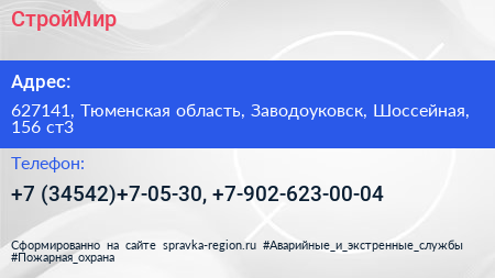 СтройМир по адресу 627141, Тюменская область, Заводоуковск, Шоссейная, 156 ст3 в дальнейшем Организация, размещена в следующих категориях: