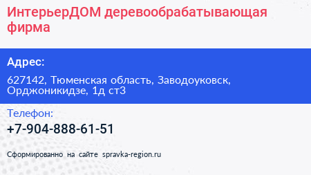 ИнтерьерДОМ, деревообрабатывающая фирма по адресу 627142, Тюменская область, Заводоуковск, Орджоникидзе, 1д ст3 в дальнейшем Организация, размещена в следующих категориях: