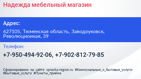 Надежда, мебельный магазин по адресу 627105, Тюменская область, Заводоуковск, Революционная, 39 в дальнейшем Организация, размещена в следующих категориях: