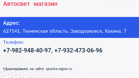 Автосвет+, магазин по адресу 627141, Тюменская область, Заводоуковск, Хахина, 7 в дальнейшем Организация, размещена в следующих категориях: