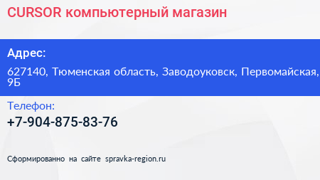 CURSOR, компьютерный магазин по адресу 627140, Тюменская область, Заводоуковск, Первомайская, 9Б в дальнейшем Организация, размещена в следующих категориях: