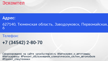 Эскомтел по адресу 627140, Тюменская область, Заводоуковск, Первомайская, 6 в дальнейшем Организация, размещена в следующих категориях: