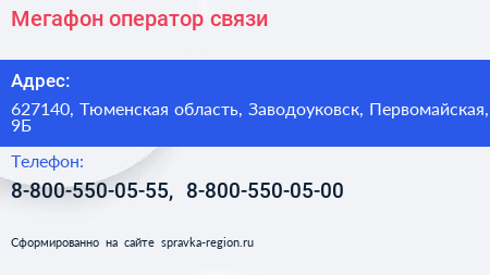 Мегафон, оператор связи по адресу 627140, Тюменская область, Заводоуковск, Первомайская, 9Б в дальнейшем Организация, размещена в следующих категориях: