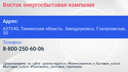 Восток, энергосбытовая компания по адресу 627140, Тюменская область, Заводоуковск, Глазуновская, 10 в дальнейшем Организация, размещена в следующих категориях:
