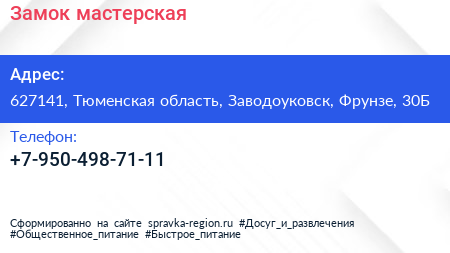 Замок, мастерская по адресу 627141, Тюменская область, Заводоуковск, Фрунзе, 30Б в дальнейшем Организация, размещена в следующих категориях: