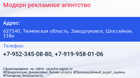 Модерн, рекламное агентство по адресу 627140, Тюменская область, Заводоуковск, Шоссейная, 118а в дальнейшем Организация, размещена в следующих категориях: