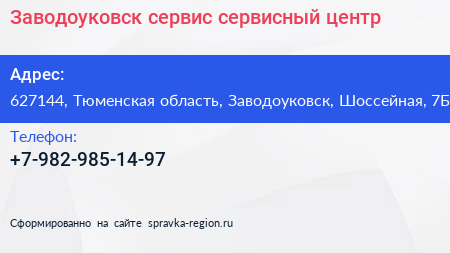 Заводоуковск-сервис, сервисный центр по адресу 627144, Тюменская область, Заводоуковск, Шоссейная, 7Б в дальнейшем Организация, размещена в следующих категориях: