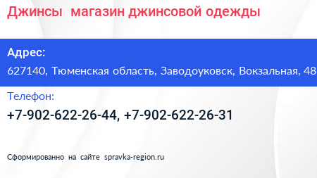 Джинсы+, магазин джинсовой одежды по адресу 627140, Тюменская область, Заводоуковск, Вокзальная, 48 в дальнейшем Организация, размещена в следующих категориях: