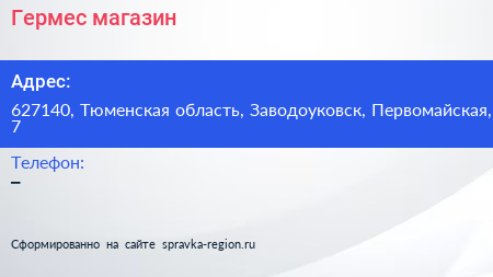 Гермес, магазин по адресу 627140, Тюменская область, Заводоуковск, Первомайская, 7 в дальнейшем Организация, размещена в следующих категориях: