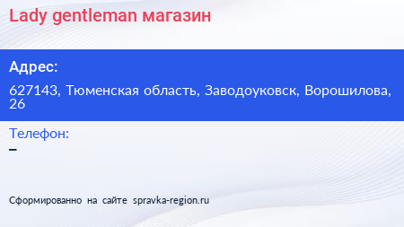 Lady & gentleman, магазин по адресу 627143, Тюменская область, Заводоуковск, Ворошилова, 26 в дальнейшем Организация, размещена в следующих категориях: