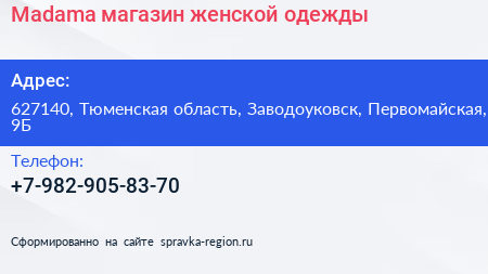 Madama, магазин женской одежды по адресу 627140, Тюменская область, Заводоуковск, Первомайская, 9Б в дальнейшем Организация, размещена в следующих категориях: