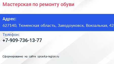 Мастерская по ремонту обуви по адресу 627140, Тюменская область, Заводоуковск, Вокзальная, 42 в дальнейшем Организация, размещена в следующих категориях: