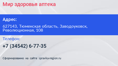 Мир здоровья, аптека по адресу 627143, Тюменская область, Заводоуковск, Революционная, 108 в дальнейшем Организация, размещена в следующих категориях: