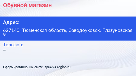 Обувной магазин по адресу 627140, Тюменская область, Заводоуковск, Глазуновская, 9 в дальнейшем Организация, размещена в следующих категориях:
