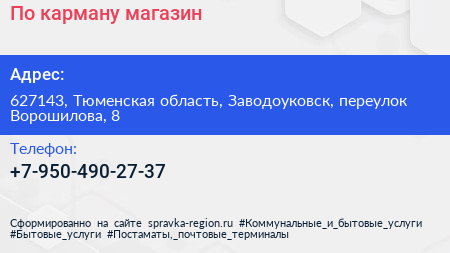 По карману, магазин по адресу 627143, Тюменская область, Заводоуковск, переулок Ворошилова, 8 в дальнейшем Организация, размещена в следующих категориях: