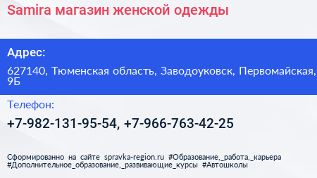 Samira, магазин женской одежды по адресу 627140, Тюменская область, Заводоуковск, Первомайская, 9Б в дальнейшем Организация, размещена в следующих категориях:
