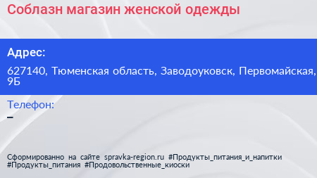Соблазн, магазин женской одежды по адресу 627140, Тюменская область, Заводоуковск, Первомайская, 9Б в дальнейшем Организация, размещена в следующих категориях: