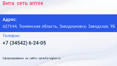 Вита+, сеть аптек по адресу 627144, Тюменская область, Заводоуковск, Заводская, 9Б в дальнейшем Организация, размещена в следующих категориях: