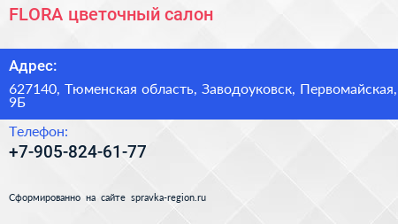 FLORA, цветочный салон по адресу 627140, Тюменская область, Заводоуковск, Первомайская, 9Б в дальнейшем Организация, размещена в следующих категориях:
