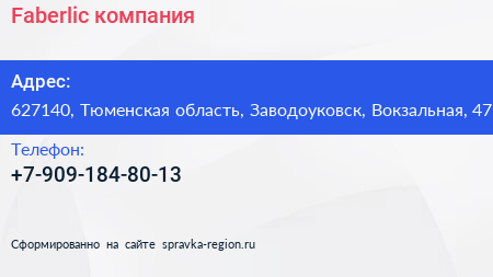 Faberlic, компания по адресу 627140, Тюменская область, Заводоуковск, Вокзальная, 47 в дальнейшем Организация, размещена в следующих категориях: