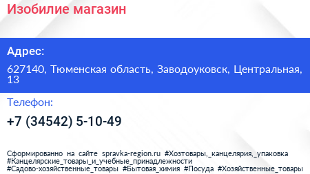 Изобилие, магазин по адресу 627140, Тюменская область, Заводоуковск, Центральная, 13 в дальнейшем Организация, размещена в следующих категориях: