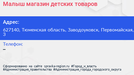 Малыш, магазин детских товаров по адресу 627140, Тюменская область, Заводоуковск, Первомайская, 3 в дальнейшем Организация, размещена в следующих категориях: