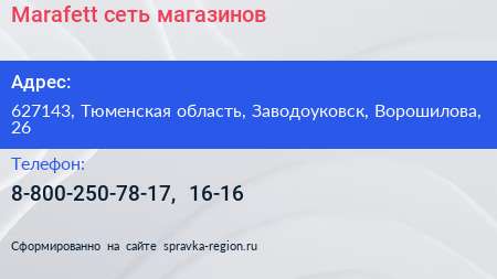 Marafett, сеть магазинов по адресу 627143, Тюменская область, Заводоуковск, Ворошилова, 26 в дальнейшем Организация, размещена в следующих категориях: