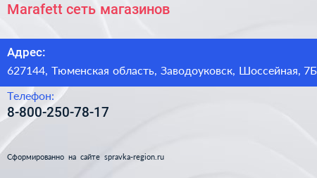 Marafett, сеть магазинов по адресу 627144, Тюменская область, Заводоуковск, Шоссейная, 7Б в дальнейшем Организация, размещена в следующих категориях:
