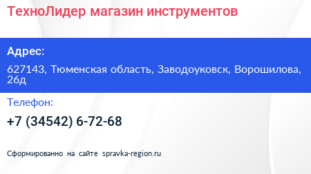 ТехноЛидер, магазин инструментов по адресу 627143, Тюменская область, Заводоуковск, Ворошилова, 26д в дальнейшем Организация, размещена в следующих категориях: