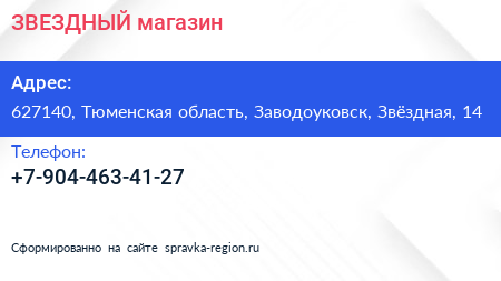 ЗВЕЗДНЫЙ, магазин по адресу 627140, Тюменская область, Заводоуковск, Звёздная, 14 в дальнейшем Организация, размещена в следующих категориях: