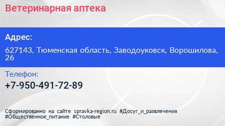 Ветеринарная аптека по адресу 627143, Тюменская область, Заводоуковск, Ворошилова, 26 в дальнейшем Организация, размещена в следующих категориях: